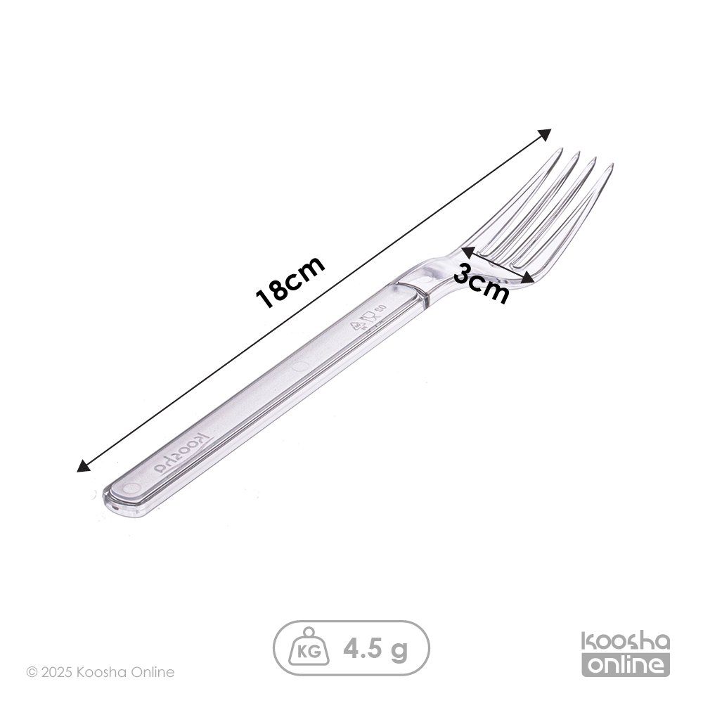 چنگال یکبار مصرف غذاخوری آیریک دارای رنگ های شفاف ، سفید ، مشکی ، بلک لایت (سه رنگ سبز فسفری ، نارنجی فسفری و صورتی فسفری) می باشد.